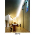歌隊席と、外部聖堂の二つの聖堂は其々の特徴をもちつつ、緩やかな曲面の天井を共有することで、一体の空間を感じることができる。内陣を共有しつつ鍛造のスクリーンが聖と俗を分かつ。壁の素朴な素材感と光のコントロールで静謐な明るさを与え、専心できることを大切にした。歌隊席の低天井の側廊は、共同の祈りを意識し、緩やかに湾曲したカーブで囲む。天井は湾曲しながら高窓へ向かい、祈りが昇華していく。外部聖堂は天井の高い奥行きのある空間を意識し、正面の壁にほのかに外光を与えるために、外へ向かって僅かに開いた。歌隊席への回廊は、小さなステンドグラスの間隔を次第に変化させ、緩やかなスロープによって気持ちが自然に聖堂へと導かれる。