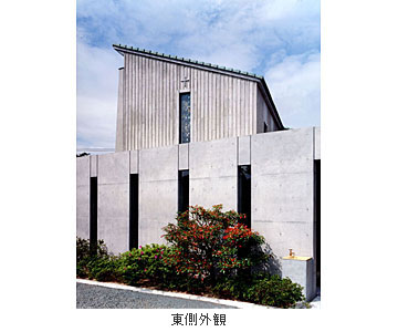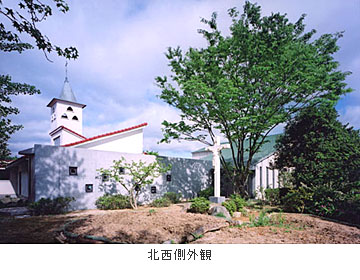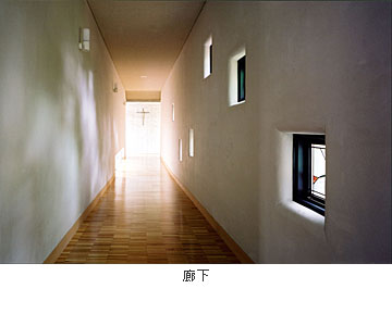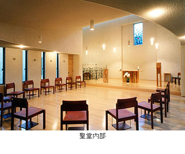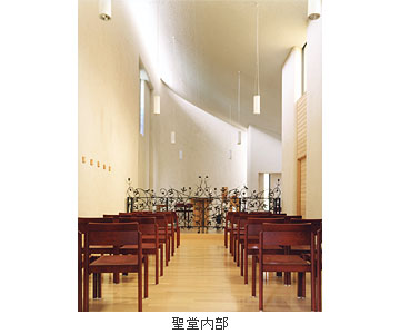 歌隊席と、外部聖堂の二つの聖堂は其々の特徴をもちつつ、緩やかな曲面の天井を共有することで、一体の空間を感じることができる。内陣を共有しつつ鍛造のスクリーンが聖と俗を分かつ。壁の素朴な素材感と光のコントロールで静謐な明るさを与え、専心できることを大切にした。歌隊席の低天井の側廊は、共同の祈りを意識し、緩やかに湾曲したカーブで囲む。天井は湾曲しながら高窓へ向かい、祈りが昇華していく。外部聖堂は天井の高い奥行きのある空間を意識し、正面の壁にほのかに外光を与えるために、外へ向かって僅かに開いた。歌隊席への回廊は、小さなステンドグラスの間隔を次第に変化させ、緩やかなスロープによって気持ちが自然に聖堂へと導かれる。