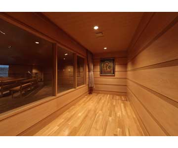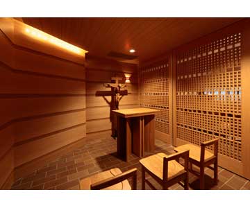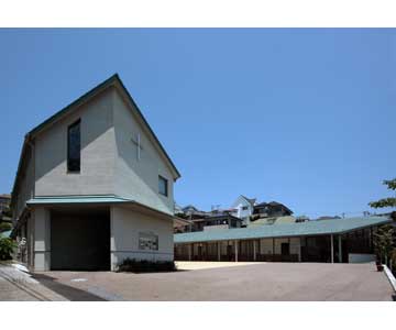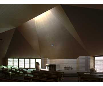 この地に教会が建設されて50年がたち、建物老朽化にともなう建替え計画である。閑静な住宅街の中にありながら、存在を主張しすぎないよう庇の高さを抑え教会のボリュームを和らげた。中庭空間は、親しみやすく住宅地の中にある誰もが集えるポケットパークとなる場の創出を目指した。内部空間は、南東に向けた高窓から聖堂にステンドグラス越しに陽の光が射し込み、主日のミサの時間には内陣に豊かな光が降り注ぐ聖堂空間をイメージした。また、限られたボリュームに平面的な奥行き感を与えるため、内陣北側の広場を緑化し外の内陣としてしつらえた。格子越しに北側の安定した光環境の緑を取り込むことで、聖堂に豊かな拡がりを感じられる空間を創ることを目指した。